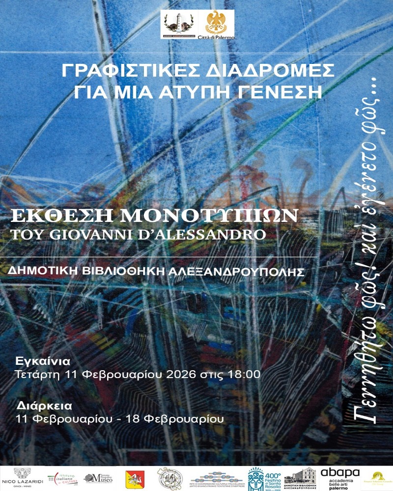 Ο Δήμος Αλεξανδρούπολης υποδέχεται στην Δημοτική Βιβλιοθήκη την Έκθεση Μονοτυπιών του Giovanni D’ Alessandro με τίτλο “ΓΡΑΦΙΣΤΙΚΕΣ ΔΙΑΔΡΟΜΕΣ ΓΙΑ ΜΙΑ ΑΤΥΠΗ ΓΕΝΕΣΗ” την Τετάρτη 11 Φεβρουαρίου 2026 στις 6μμ.