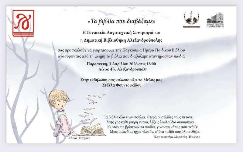 Σε ένα πενθήμερο συντονισμένων πανελληνίων δράσεων στις Δημοτικές Βιβλιοθήκες με αφορμή την Παγκόσμια Ημέρα Παιδικού Βιβλίου ο Δήμος Αλεξανδρούπολης συντονίζεται με 20 πόλεις ακόμη και υποδέχεται στην Δημοτική Βιβλιοθήκη τον πανελλήνιο οργανισμό Γυναικεία Λογοτεχνική Συντροφιά σε μια γιορτή για τους μικρούς μας αναγνώστες με θέμα: «Τα βιβλία που διαβάζαμε».